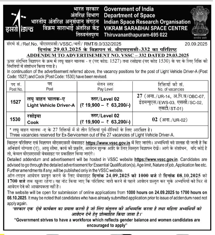 ISRO Cook and Driver Recruitment 2025: भारतीय अंतरिक्ष अनुसंधान संगठन के तहत विक्रम साराभाई अंतरिक्ष केंद्र के लिए भर्ती का नोटिफिकेशन जारी कर दिया है इसमें रसोईया और ड्राइवर के पदों पर भर्ती की जाएगी इसके लिए महिला और पुरुष दोनों अभ्यर्थी ऑनलाइन मोड में आवेदन फॉर्म भर सकते हैं इसरो रसोईया और ड्राइवर भर्ती के लिए ऑनलाइन आवेदन 24 सितंबर 2025 को सुबह 10:00 से शुरू हो गए हैं और आवेदन करने की अंतिम तिथि 8 अक्टूबर 2025 को शाम 5:00 तक रखी गई है।